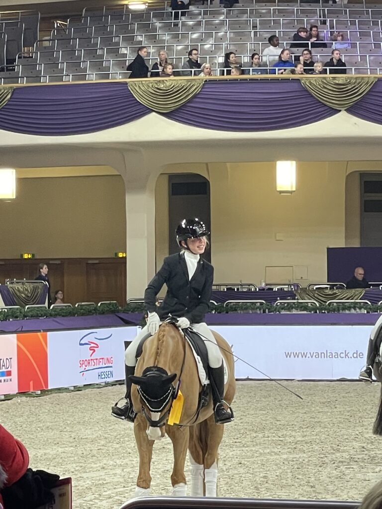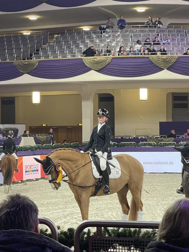 Was ein Tag! Für Pauline und ihre Buona Sera ging es am Donnerstagmittag nach Frankfurt in die „Gud Stubb“ wie man so schön, dass Frankfurter Festhallen Turnier nennt. Begleitet von ihrer Trainerinnen Ella Alea Maulhardt und Auszubildenden Lola Nord erkundeten die drei erst einmal Abreiteplatz und Viereck.