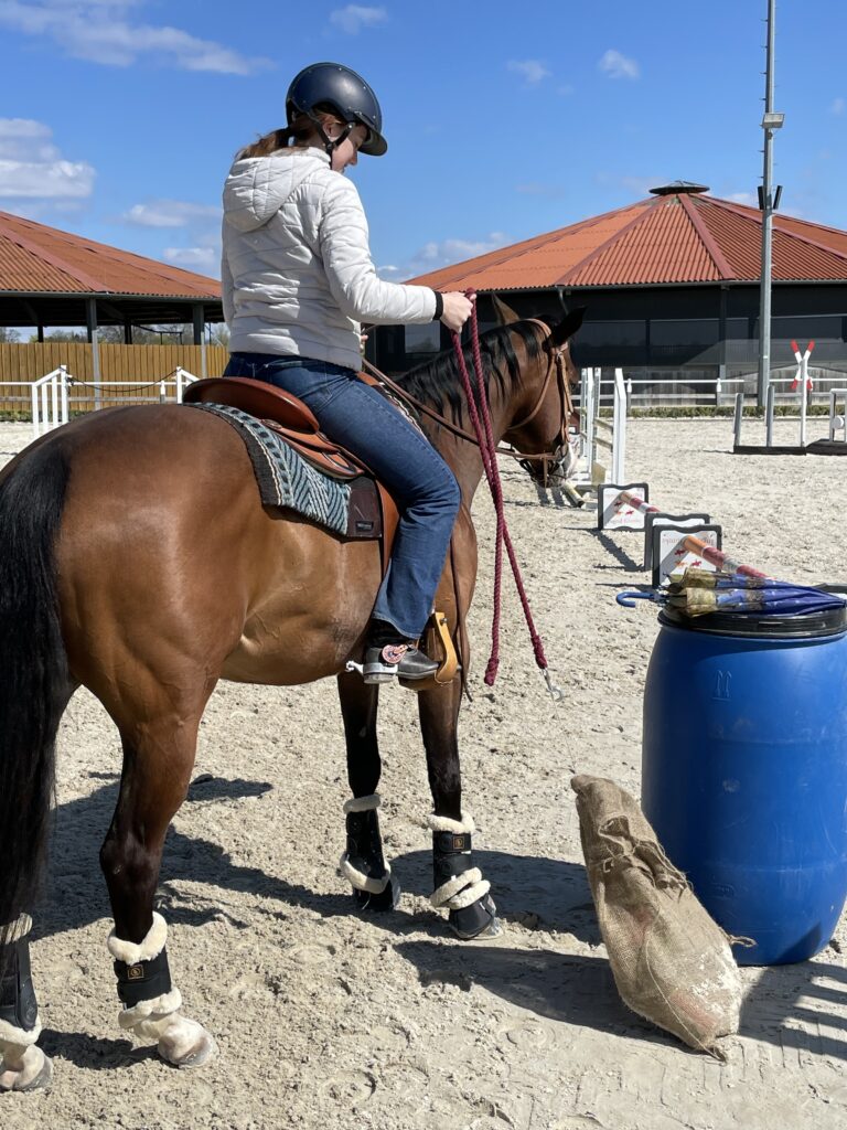 Am ersten Aprilwochenende fand auf Hofgut Liederbach ein zweitägiger Trail- und Gelassenheitskurs unter der Leitung von Westerntrainerin Claudia Bingel statt. Die fünfundzwanzig Teilnehmerinnen und Teilnehmer konnten sich den fantasievollen Parcours mit ihren Pferden vom Sattel oder vom Boden aus erarbeiten. Musste am ersten Tag wegen des schlechten Wetters noch in der Reithalle geritten werden, konnte der abwechslungsreiche Parcours am Sonntag bei strahlendem Sonnenschein auf dem Springplatz aufgebaut werden. Die Aufgaben waren vielseitig und für Pferde und Reiter spannend: Das Durchreiten eines Tors mit Flatterbändern, die Überquerung einer Holzbrücke und eines Baumstamms mussten gemeistert werden, ebenso wie das Aufspannen eines Regenschirms vom Sattel aus. Das „Bällebad“, eine blaue Plane mit bunten Plastikbällchen oder die „Luftballonschlucht“ waren weitere Stationen, an denen Nervenstärke und Vertrauen der Vierbeiner getestet werden konnten.