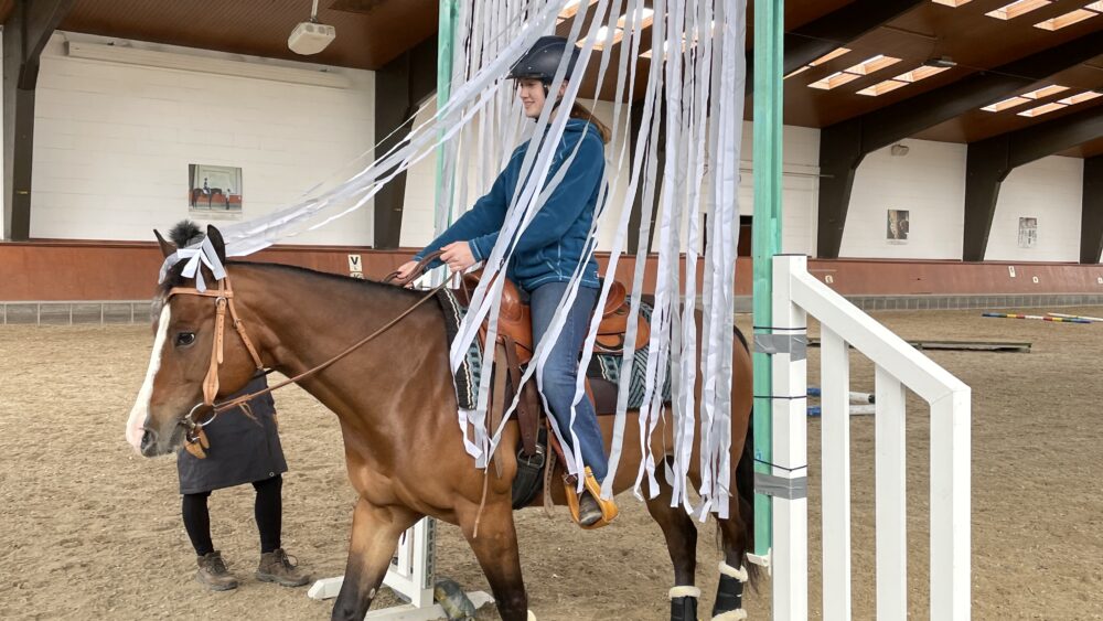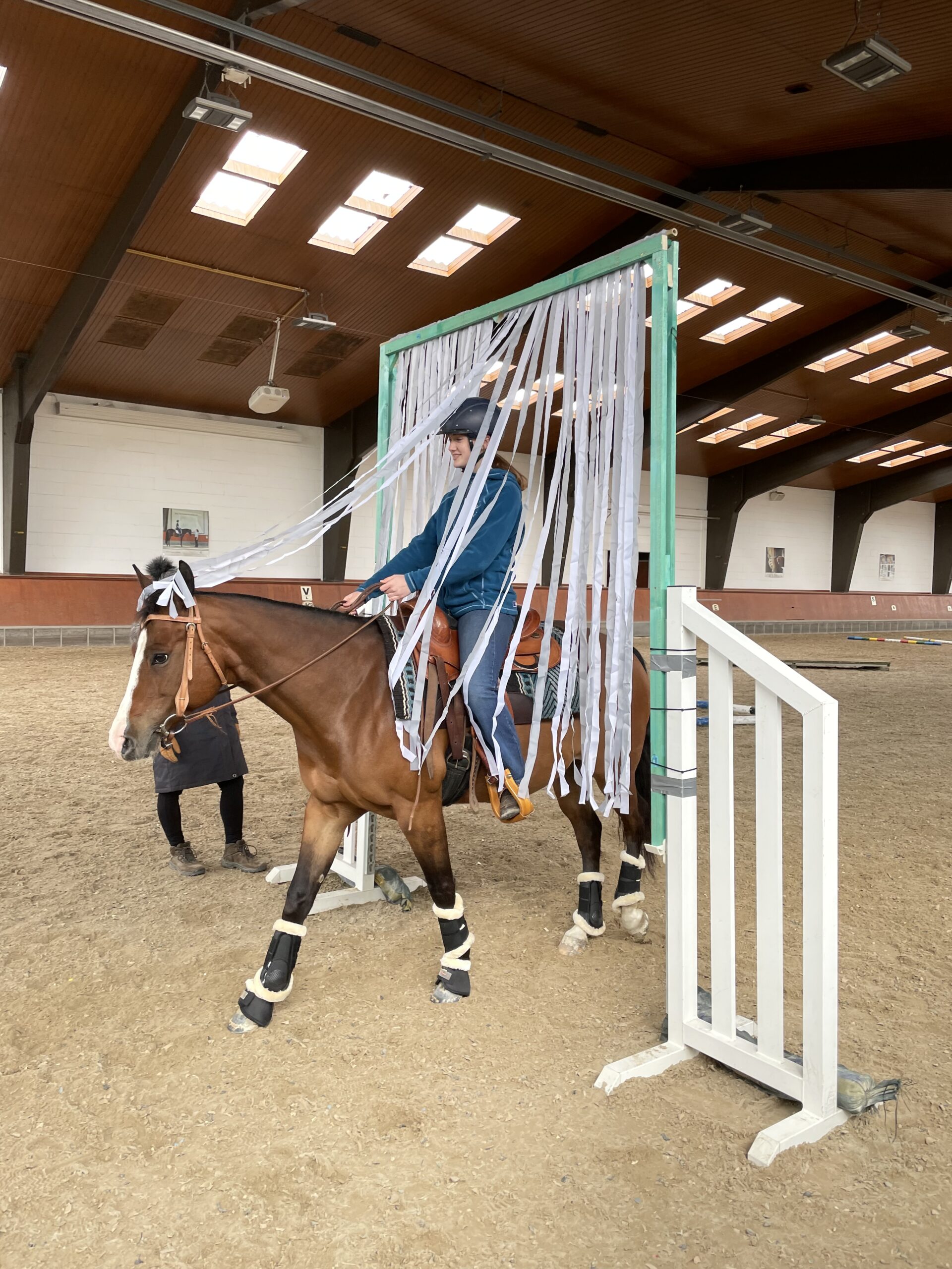 Am ersten Aprilwochenende fand auf Hofgut Liederbach ein zweitägiger Trail- und Gelassenheitskurs unter der Leitung von Westerntrainerin Claudia Bingel statt. Die fünfundzwanzig Teilnehmerinnen und Teilnehmer konnten sich den fantasievollen Parcours mit ihren Pferden vom Sattel oder vom Boden aus erarbeiten. Musste am ersten Tag wegen des schlechten Wetters noch in der Reithalle geritten werden, konnte der abwechslungsreiche Parcours am Sonntag bei strahlendem Sonnenschein auf dem Springplatz aufgebaut werden. Die Aufgaben waren vielseitig und für Pferde und Reiter spannend: Das Durchreiten eines Tors mit Flatterbändern, die Überquerung einer Holzbrücke und eines Baumstamms mussten gemeistert werden, ebenso wie das Aufspannen eines Regenschirms vom Sattel aus. Das „Bällebad“, eine blaue Plane mit bunten Plastikbällchen oder die „Luftballonschlucht“ waren weitere Stationen, an denen Nervenstärke und Vertrauen der Vierbeiner getestet werden konnten.